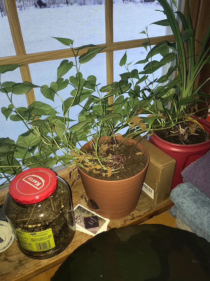 You may not know it, but in the summer when you go to the nursery some of the long leafy vines for window boxes ARE sweet potato varieties! They have a beautiful vine that will flower a beautiful flower that resembles a morning glory. They tend to grow out or down and don’t have the tendrils that can climb up. This potato has grown beautiful vines and I think I am going to hang it to be an indoor houseplant. What a cheap beautiful plant and if you have a brown thumb, they are cheap and pretty easy to start over if something happens to it.